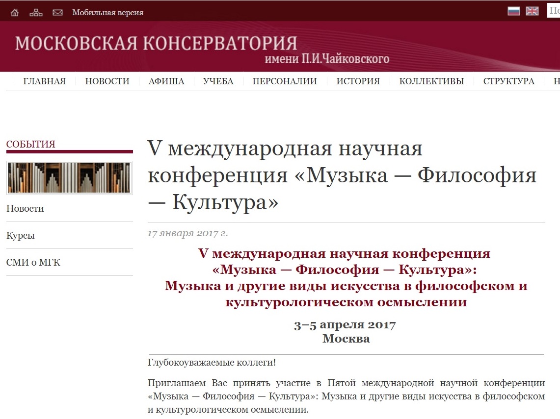 Площадка / концертный залКонференц-зал МГКНебольшое описаниеV международная научная конференция «Музыка — Философия — Культура»: Музыка и другие виды искусства в философском и культурологическом осмыслении