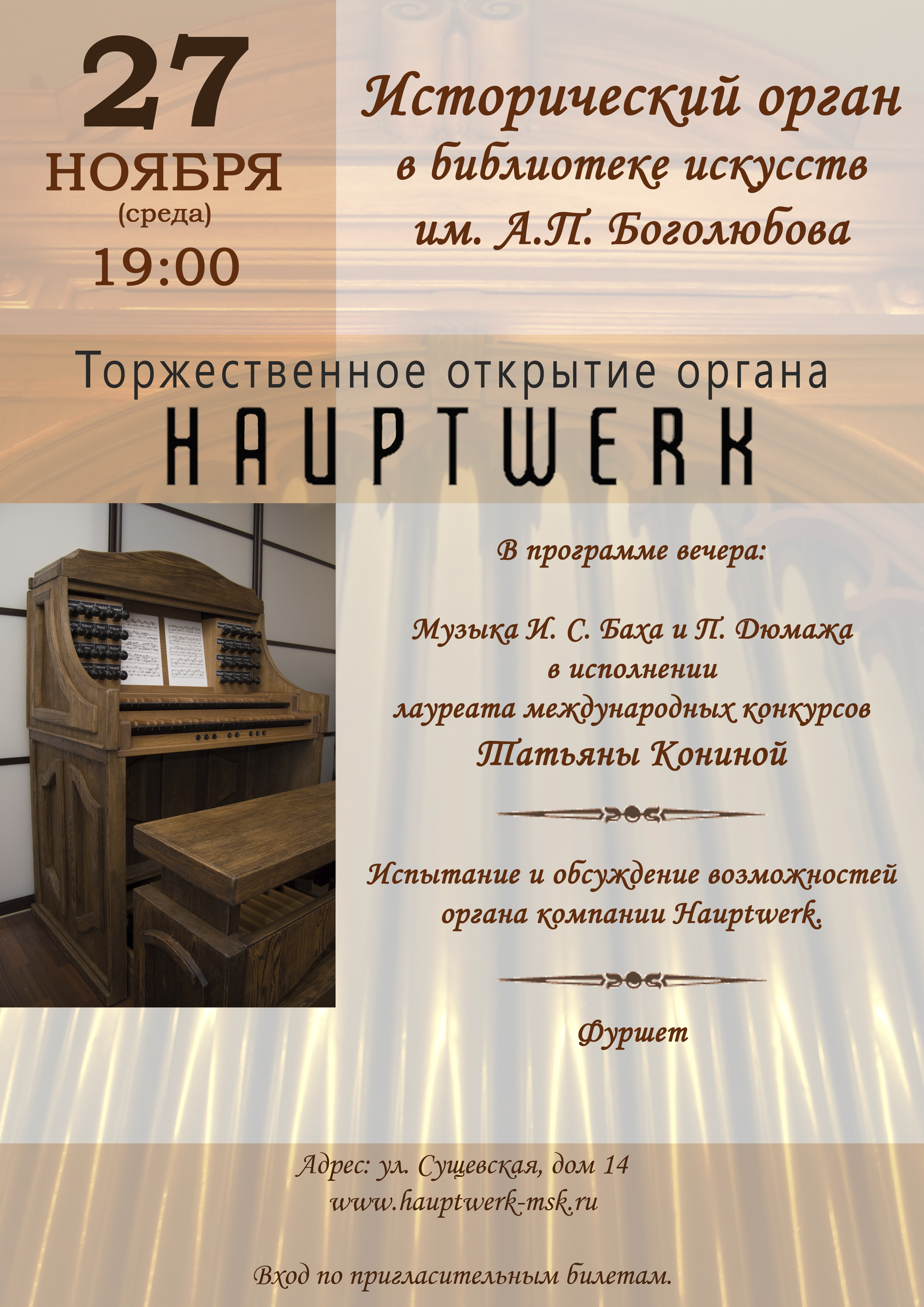 Площадка / концертный залБиблиотека искусств им. А.П. БоголюбоваНебольшое описаниеВ программе вечера: Музыка И. С. Баха и П. Дюмажа в исполнении лауреата международных конкурсов Татьяны Кониной; Испытание и обсуждение возможностей органа компании Hauptwerk. Фуршет Адрес: ул. Сущевская, дом 14 (4 минуты от м.Новослободская) www.hauptwerk-msk.ru