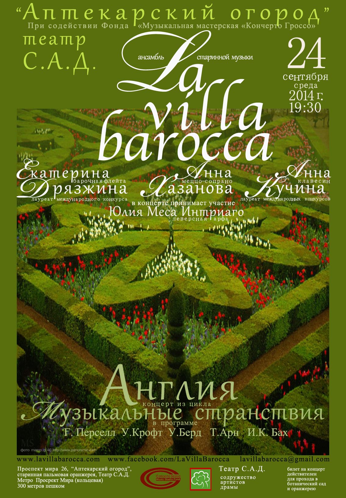 Площадка / концертный залаптекарский огород, театр С.А.Д.Небольшое описаниеКонцерт будет посвящен ретроспективе английской музыки от раннего барокко до предклассического периода. В концерте прозвучат сочинения для клавира английских вирджиналистов и Томаса Арна, песни Джона Доуленда и Генри Перселла, сольные пьесы для арфы Генри Перселла, камерные сочинения для барочной флейты, блокфлейты и клавесина Уильяма Крофта и Иоганна Кристиана Баха.